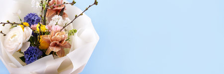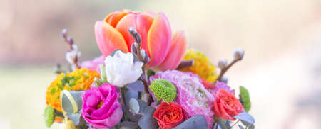 A bright spring bouquet of daffodils, hyacinths, roses, ranunculus, tulips, lilac and a branch of prunus. Hello spring. Banner