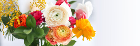 Background banner with colorful beautiful floral bouquet of garden flowers with copy space on a white background.