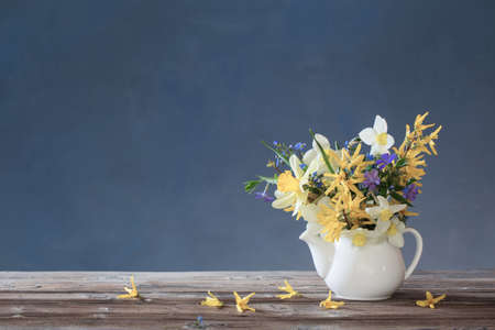 white and yellow spring flowers in teapot on wooden table on blue background