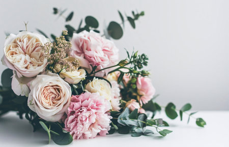 A stunning close-up shot of a pastel pink and white flower bouquet. Roses, peonies, and eucalyptus leaves create an elegant floral arrangement.