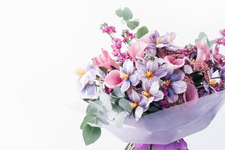 bouquet of flowers wrapped in purple paper. bouquet in shades of pink, purple and white lilies, tulips and other small flowers. floral card. Mothers day, International Womens Day