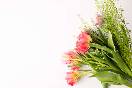 Bouquet of spring flowers on a white background with copy space