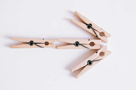 Wooden clothespins on white background with folded arrow. View from above
