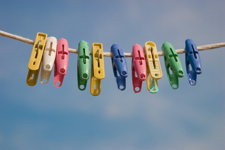 Rope with plastic cloth clips against the blue sky.