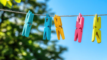A close-up image featuring an array of colorful clothespins hanging on a clothesline under a clear blue sky. The setting evokes a cheerful, sunny day perfect for outdoor activities. The vibrant colors contrast beautifully against the natural backdrop, showcasing the simplicity and utility of everyday objects in a charming way.