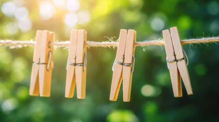 A serene scene featuring wooden clothespins hanging on a rope against a beautifully blurred green background, illuminated by soft sunlight, evoking a sense of calm and simplicity.
