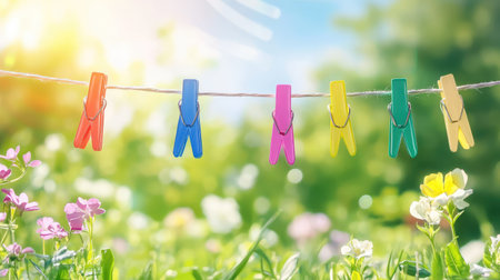 Rainbow clothespins on a line, swaying gently outdoors with a bright sky and natural garden blur, full of lively summer spirit