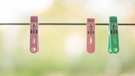 Colorful plastic clothespins on the hangers with blurred background.