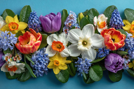 A stunning display of colorful spring flowers, including vibrant tulips and daffodils, creates a beautiful floral border against a bright turquoise background. This elegant composition, viewed from a top view perspective with ample copy space, is perfect for floral design projects, greeting cards, and invitations. The vibrant colors, combined with soft shadows and sunlight, evoke a sense of beauty and freshness, ideal for celebrating Easter, Mother's Day, or any springtime occasion.