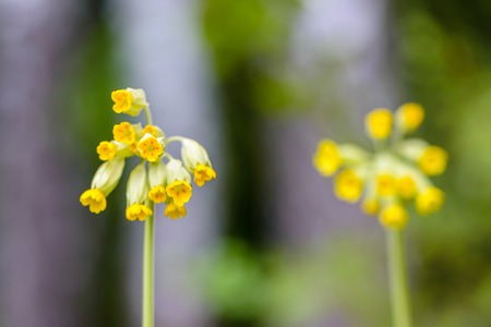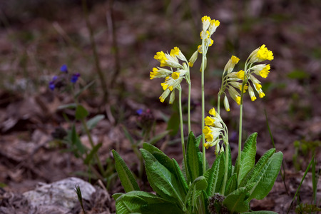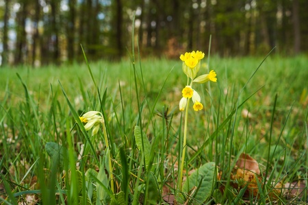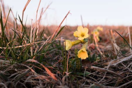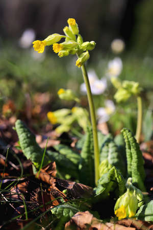 Beautiful spring yellow primrose (ox lip) flower growing in forest. Taken at sunset, low sun light.