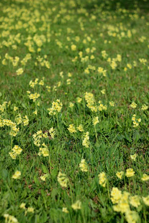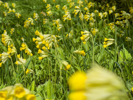 Field of yellow Cowslip flowers or Primula veris. Shallow depth of field.