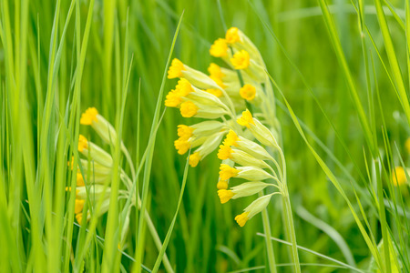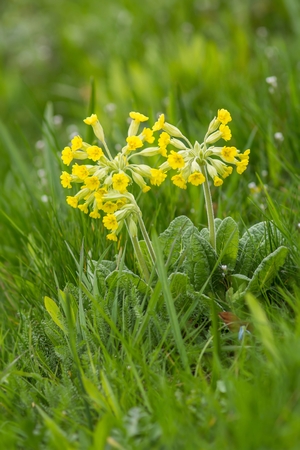 Cowslip (Primula veris). Here seen close up surrounded by green grass on meadow. Shallow depth of field, focus on front flower, low angle.