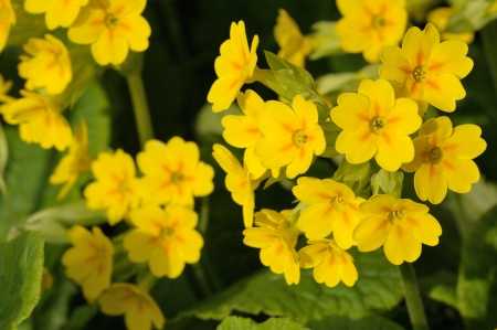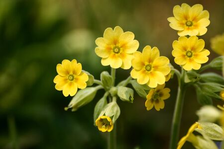 Primula veris cowslip yellow flowering plant, primrose flowers in cluster in bloom, green leaves and stem
