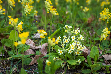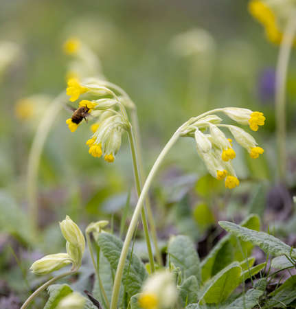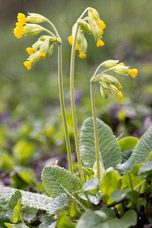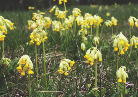 Cowslip flowers growing on a meadow during spring. Cowslips.