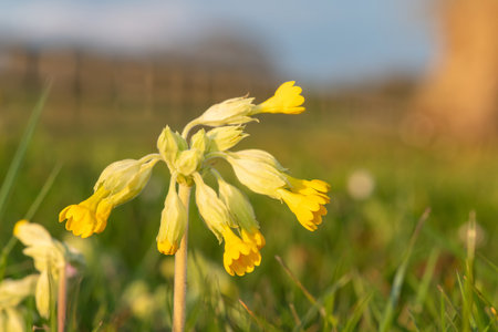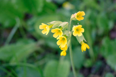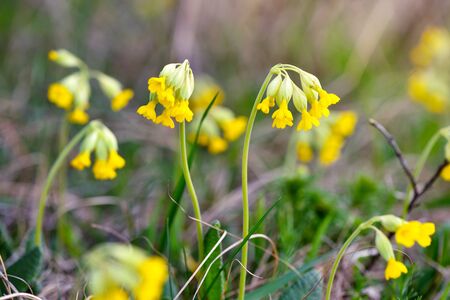 Blooming cowslip (Primula vera) flower with yellow blossoms against the blurred green grass background. Springtime flower grows in rural in meadows and fields.