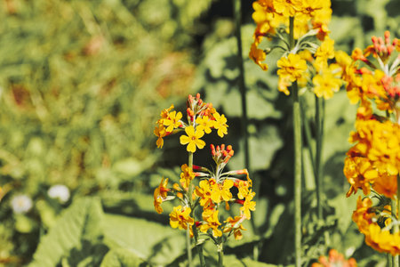 Easter concept. Primrose Primula with yellow flowers in flowerbed in spring time. Inspirational natural floral spring or summer blooming garden or park. Hello spring