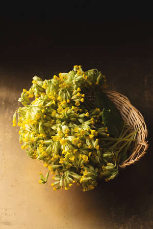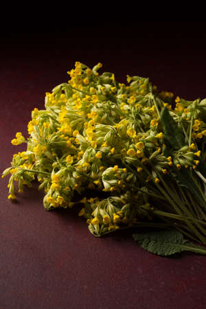 yellow spring primrose cowslip medical flower bunch on wooden table