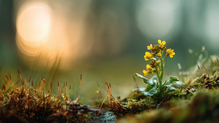 Photo of a small Primrose growing on moss at sunrise, symbolizing hope and new beginnings. Web banner with copy space on the right for product placement.