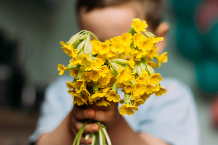 the boy hesitates hiding behind a blurry bouquet of yellow flowers. a gift to mom. to give a bouquet. gift - blurry bouquet of flowers. summer