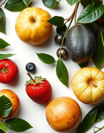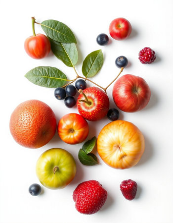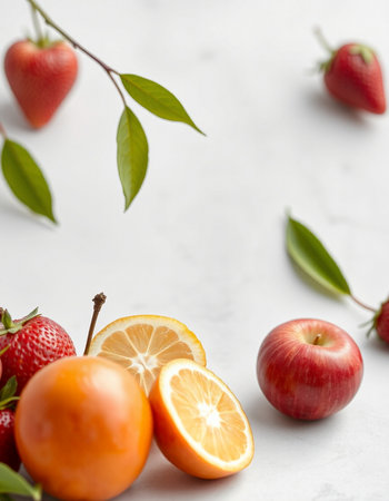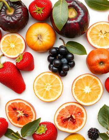 An array of vibrant fruits including orange slices, strawberries, and blueberries are artistically arranged on a clean white background, showing their fresh colors and textures.