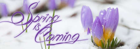Crocus in the snow-covered garden, snowdrop flower. Spring is coming text,
