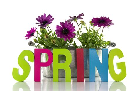 Spring, word in wooden alphabet letters isolated on colourful background, decorated with white and yellow flowers.