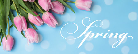 Beautiful pink tulips on light blue background, flat lay. hello spring