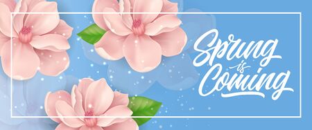 Welcome spring seasonal greetings wallpaper background for banner and commercial, beautiful nature flower and green with some sunrise.