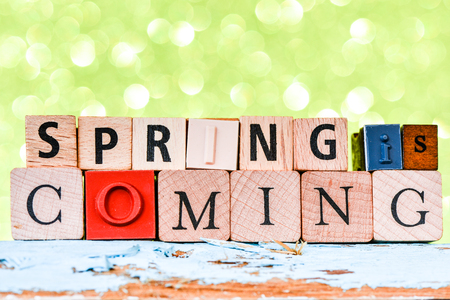 Spring Is Coming Motivational and Inspirational quotes on wooden background