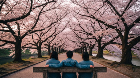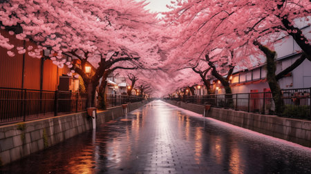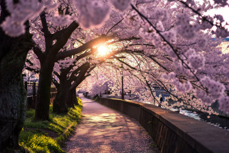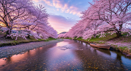 Cherry blossoms bloom along the river creating a romantic spring atmosphere at sunset