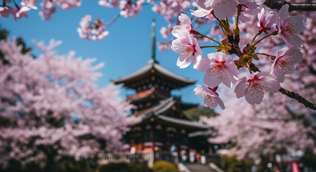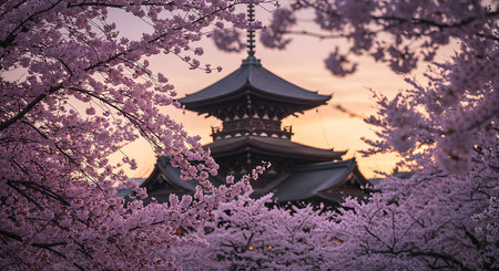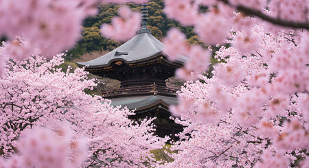 A stunning temple surrounded by vibrant pink cherry blossoms, creating a serene spring ambiance. Perfect for travel, nature, or architectural themes.