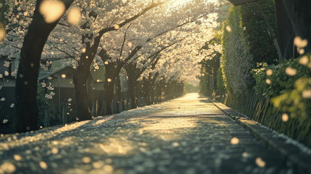 A tranquil pathway adorned with blossoming trees, inviting leisurely walks under a canopy of petals in a serene atmosphere during springtime.