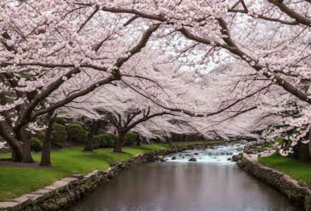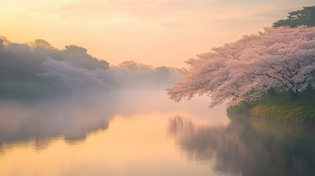 A tranquil scene featuring cherry blossom trees along a serene waterway at dawn, with soft warm light illuminating the mist for a peaceful outdoor experience.