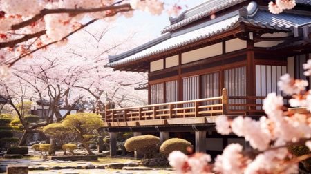 A tranquil Japanese garden showcasing a traditional wooden house nestled among blooming cherry blossoms, creating a picturesque and serene outdoor scene perfect for relaxation and reflection.