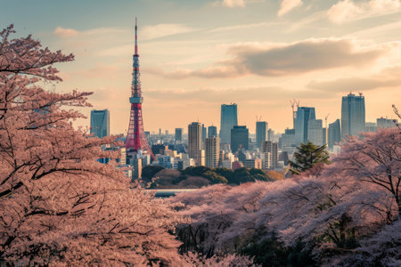 The Tokyo skyline featuring cherry blossom trees AI generated