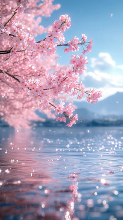 Generate a photorealistic painting of Lake Kawaguchiko, mirroring Fuji, accentuated by cherry blossom branches cascading towards the water, creating depth --chaos 30 --ar 16:9 --v 6.1 Job ID: 258a425d-0118-4b99-a29e-987379e8e279