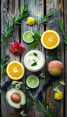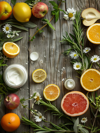 Organic creams and lotions on wooden background, surrounded by fresh fruits, herbs, and flowers.