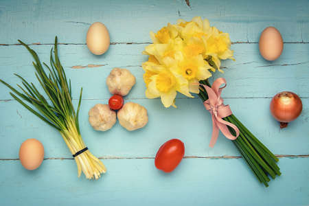 Bunch of fresh homegrown organic dill, spinach, arugula and spring onion on rustic wooden table