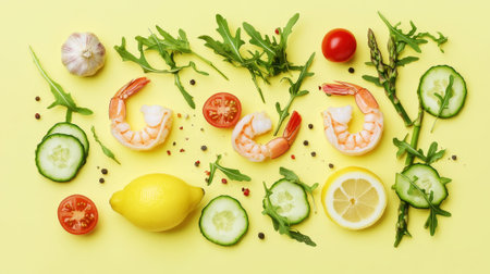 Aesthetic top view of salad ingredients: shrimp, arugula, asparagus, tomatoes. Yellow background. Generative AI.