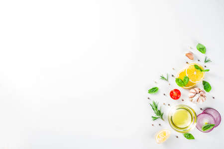 Cooking background with spices, vegetables and herbs fresh basil, rosemary, tomato, garlic, onions, lemon on a white kitchen table. Layout top view copy space. Healthy ingredients for cooking
