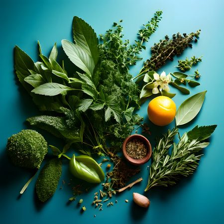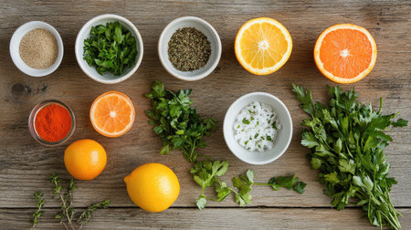 A colorful display of fresh herbs and citrus fruits arranged on a wooden table, showcasing ingredients perfect for healthy cooking and meal preparation.