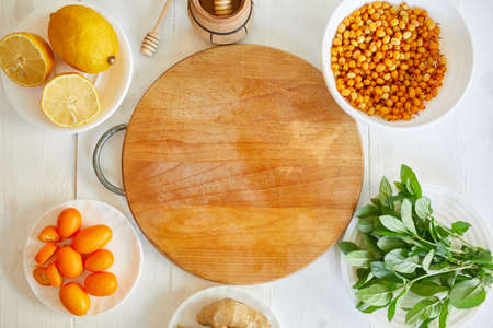 Natural cold and flu home remedies. Natural ingredients for immunity stimulation and viruses protection. top view flat lay.