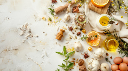 Assorted culinary ingredients like garlic, herbs, spices, and citrus fruits arranged on a white rustic background. The colorful and natural setup emphasizes themes of cooking and flavor.