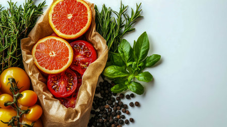 Paper shopping bag filled with fresh tomatoes, herbs, and ginger, emphasizing healthy eating, sustainability, and eco-friendly grocery practices,