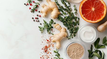 Vibrant Arrangement of Fresh Ginger, Herbs, Grapefruit, and Natural Ingredients on White Background