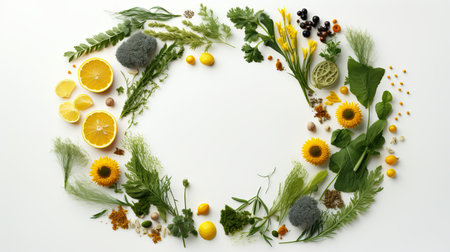 A stunning layout features an array of vibrant herbs, citrus fruits, and sunflowers arranged artistically. The bright colors create a fresh and lively atmosphere perfect for culinary inspiration.