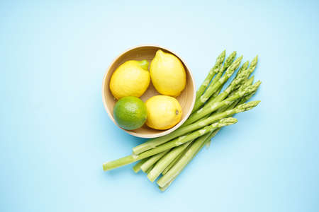Green asparagus and lemons in a bowl on a blue background, flat lay.