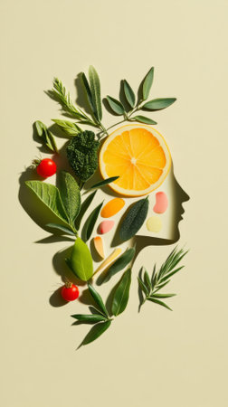 Silhouette of human profile made of citrus fruits and leaves on pastel background, AI Generated