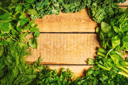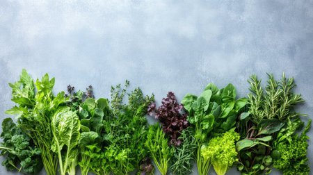 A variety of leafy greens and herbs arranged on a clean background, with copy space for food content