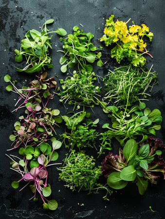 A variety of microgreens, including arugula, mustard, and cilantro, are arranged on a black surface. The vibrant colors and high contrast emphasize the freshness of these edible sprouts.